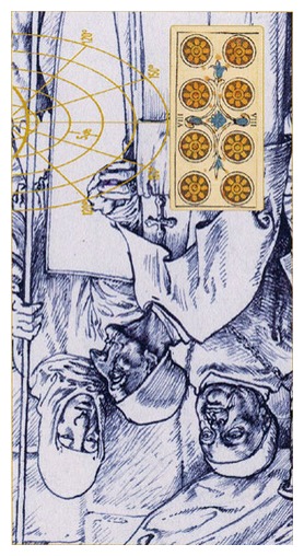 The 8 of Pentacles is about keeping up the hard work you're doing, and trying to be happy about doing that work at the same time. While the 3 of Pentacles is about completing a masterpiece, the 8 of Pentacles is about doing the apprentice work that makes you a master of your trade.