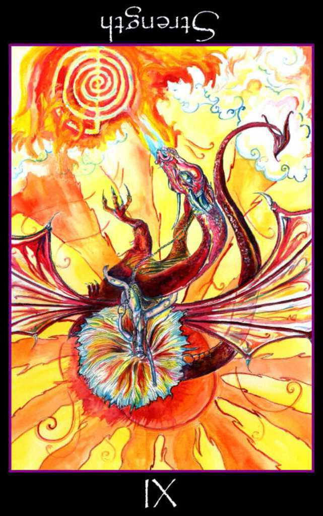This card carries the number 11. In the Rider-Waite deck, Strength and Justice have swapped places because Waite saw links with the astrological signs Leo and Libra.