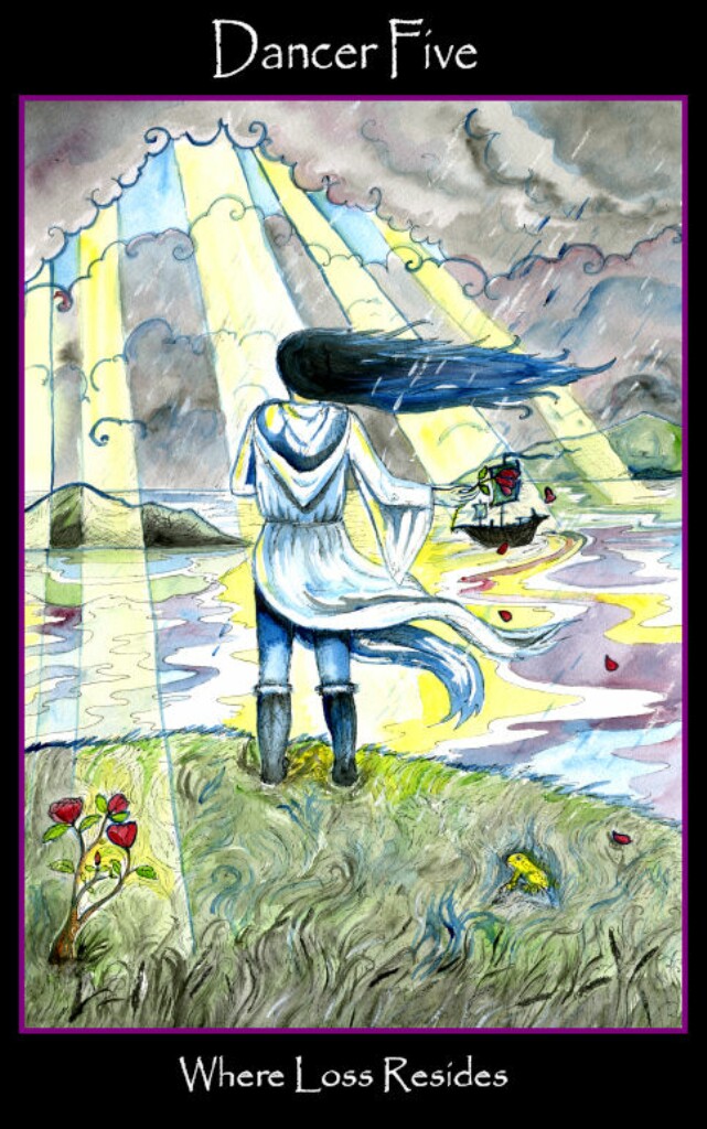 The person in the center of the card has completed many journeys already, and is completely at ease. Yet she continues to move, for having reached your goals is no reason to stop moving.