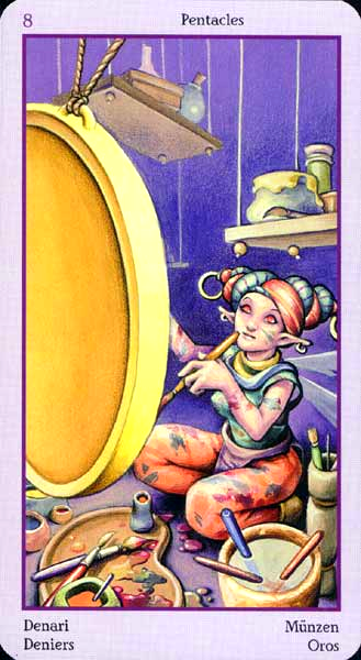 The 8 of Pentacles is about keeping up the hard work you're doing, and trying to be happy about doing that work at the same time. While the 3 of Pentacles is about completing a masterpiece, the 8 of Pentacles is about doing the apprentice work that makes you a master of your trade.