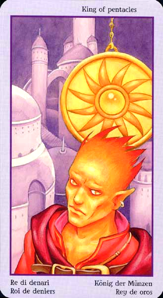 The King of Pentacles uses his Earthly attributes to rule. He goes about his work like an old style business man; he avoids unnecessary risks, aims for real results, and acts from confidence.