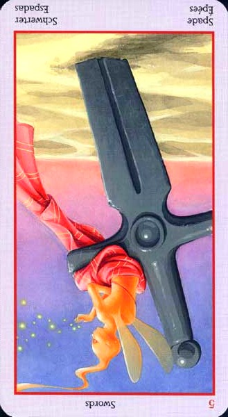 The 5 of Swords is about facing reality. The 5 is an assignment number, and in the slighly more difficult suit of Swords, it means you face a difficult challenge where your past experiences could hold you down.