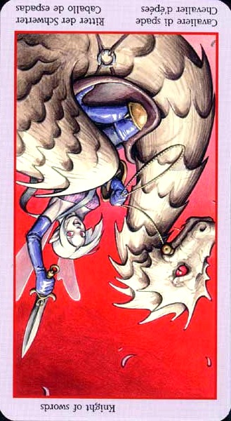 The Knight of Swords lacks the naivety of the Knight of Wands, he has analyzed the terrain ahead and weighed his options there. He knows what his own nature can throw into the mix, but does not let himself be held idle by that. The activities ahead will likely include the solving of conflicts and problems on your road to your ideal.