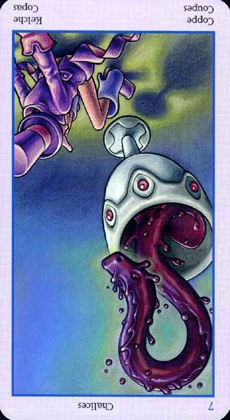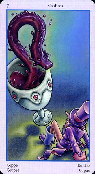 The 7 of Cups is about making a choice between different ideals. But Cups, with the water element, don't like making definitive choices that much, making this 7 in this suit a bit of a hard choice.