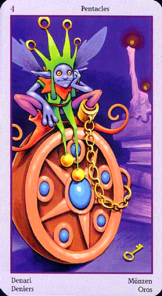 The 4 of Pentacles is about holding on to what you got. The number 4 represents structure and order, and fits well with the suit's element, Earth.