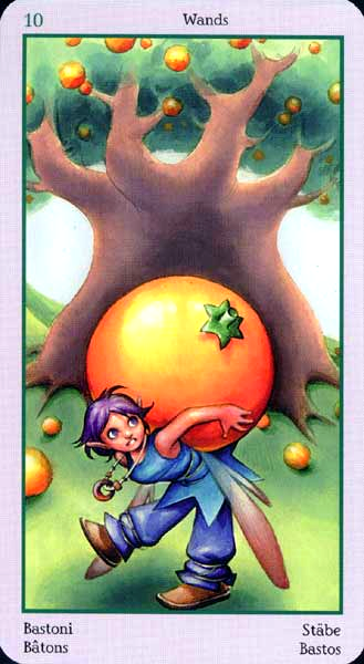 The 10 of Wands is therefore the transition from the element Fire (associated with Wands) to the element Water, associated with Cups. As you might imagine, this not the easiest of transitions.