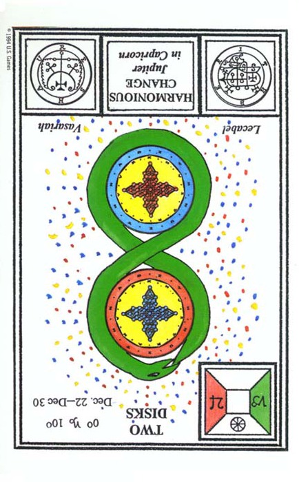 The 2 of Pentacles is an assignment number card, and the assignment here is to maintain a happy and relaxed attitude during a wait for results of what you started.