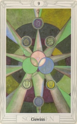 The 9 of Pentacles represents earned rest. The element Earth, attached to the Pentacles suit, appreciates the rest that completion of hard work brings. This is a good time for games and relaxation.