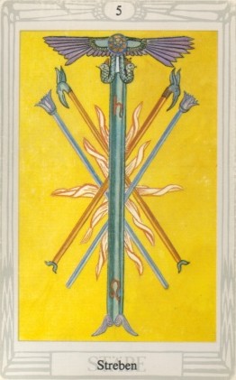 The 5 of Wands represents competition. The 5 is the second assignment number, and therefore a difficult card. 5 combined with the Wand's element fire challenges you. You'll have to fight hard for your idea, but you stand a good chance of succeeding.