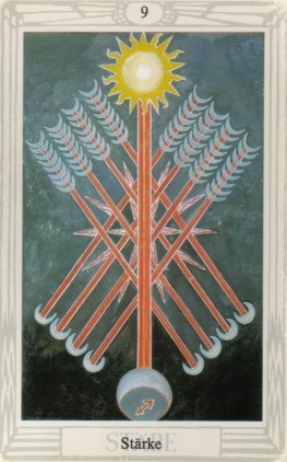 The 9 represents rest after work, which is another thing (like 8) that the element Fire associated with Wands is not very comfortable with. Fire likes to keep going. This rest will probably be spent thinking about what to do next along the course to completion.
