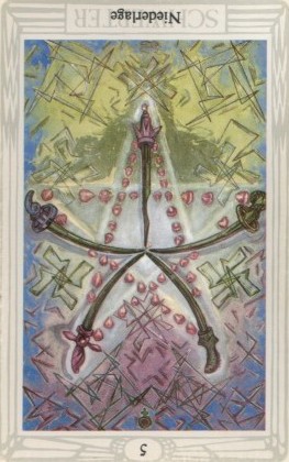 The 5 of Swords is about facing reality. The 5 is an assignment number, and in the slighly more difficult suit of Swords, it means you face a difficult challenge where your past experiences could hold you down.