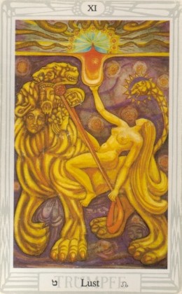 This card carries the number 11. In the Rider-Waite deck, Strength and Justice have swapped places because Waite saw links with the astrological signs Leo and Libra.