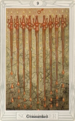 The 9 of Swords represents relief from cropped-up grief. The number 9 is a number of reward and rest and accomplishment. In the element of Swords there is not a lot of time for rest, but without any rest you'd just burn yourself out.
