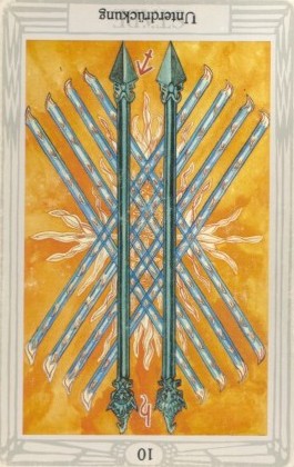 The 10 of Wands is therefore the transition from the element Fire (associated with Wands) to the element Water, associated with Cups. As you might imagine, this not the easiest of transitions.