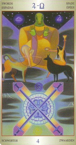 4 is the first number in the cycle of giving things shape. It's about making things real. The element of Swords also relates to making things real, so this enhances the effect so much that arrogance can cause you to exhaust yourself.