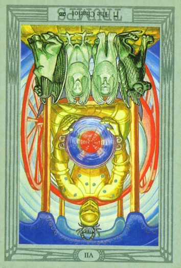 During the prevous card, The Lovers, all the wisdom of the first cards in the deck has been processed and a choice was made for personal growth. Now it's time to do something with all this baggage, to actually travel the road. A lot has been done so far, wisdoms have been accumulated and integrated into one's personality.