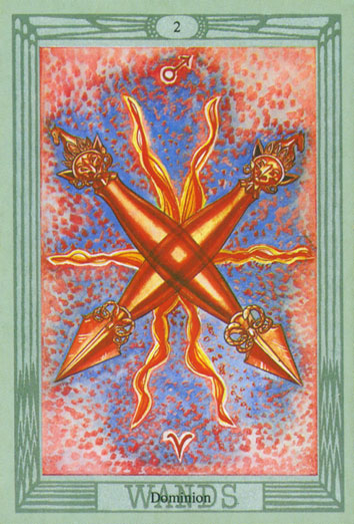 The 2 of Wands represents the research and digestion of a new idea. The number of this card and it's element are somewhat in conflict; while the 2 is focussed inwards, the Wand's element fire is outgoing. Fire wants to steam ahead while the blackbox 2 asks for patience.