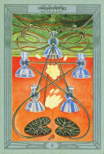 The 5 of Cups is about overcoming sadness and disappointment. You've let go of your old securities to embrace the new and exciting, now something has gone awry and you feel bad about that. But don't forget to notice those things that did go right.