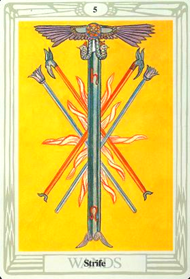 The 5 of Wands represents competition. The 5 is the second assignment number, and therefore a difficult card. 5 combined with the Wand's element fire challenges you. You'll have to fight hard for your idea, but you stand a good chance of succeeding.