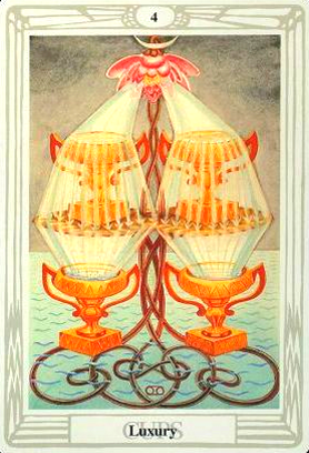 With the 4, the second cycle of this suit is commenced, where a choice between structure and feeling has to be made, where old securities have to be let go of to work towards a new future. But like Wands, Cups don't like structure much, they prefer to be free and dream rather than to make commitments and go for something.