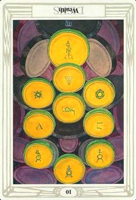 The 10 of Pentacles represents material posessions. The number 10 of Pentacles forms the links to the Ace (first card) of Wands (the first suit in the minor Arcana), and thus prepares to bring you back to the beginning of the minor Arcana, ready for a next cycle through the tarot.