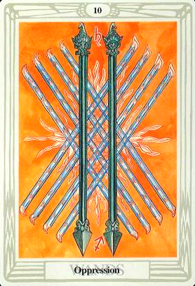 The 10 of Wands is therefore the transition from the element Fire (associated with Wands) to the element Water, associated with Cups. As you might imagine, this not the easiest of transitions.