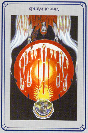 The 9 represents rest after work, which is another thing (like 8) that the element Fire associated with Wands is not very comfortable with. Fire likes to keep going. This rest will probably be spent thinking about what to do next along the course to completion.