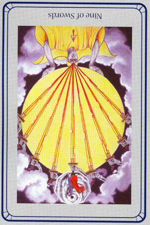 The 9 of Swords represents relief from cropped-up grief. The number 9 is a number of reward and rest and accomplishment. In the element of Swords there is not a lot of time for rest, but without any rest you'd just burn yourself out.