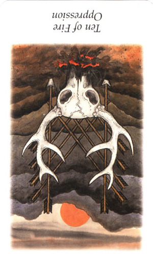 The 10 of Wands is therefore the transition from the element Fire (associated with Wands) to the element Water, associated with Cups. As you might imagine, this not the easiest of transitions.