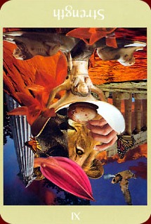 This card carries the number 11. In the Rider-Waite deck, Strength and Justice have swapped places because Waite saw links with the astrological signs Leo and Libra.
