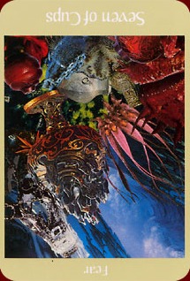 The 7 of Cups is about making a choice between different ideals. But Cups, with the water element, don't like making definitive choices that much, making this 7 in this suit a bit of a hard choice.