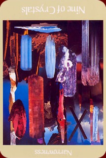 The 9 of Swords represents relief from cropped-up grief. The number 9 is a number of reward and rest and accomplishment. In the element of Swords there is not a lot of time for rest, but without any rest you'd just burn yourself out.