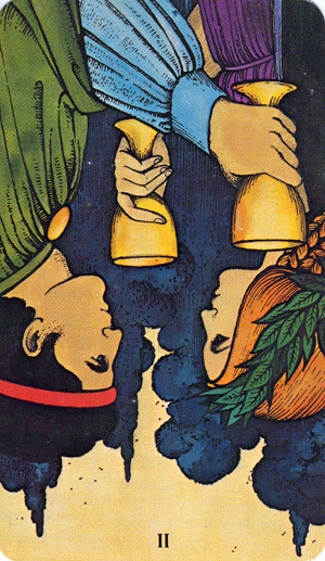 This the first assignment number of the Cups suit. Unlike Wands, with the Fire element, Cups, with the water element, has a lot more patience. Water is by nature more introspective, and this second card in the Cups suit is indeed about exploring yourself. The outcome is uncertain as always, but it usually results in better acceptance of yourself.