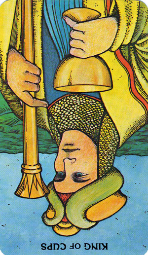 The King of Cups uses his intuition to achieve his ideals. Since Cups are turned inward, and Kings turned to the outside world, this card might be a difficult one, or it could be a powerful one.