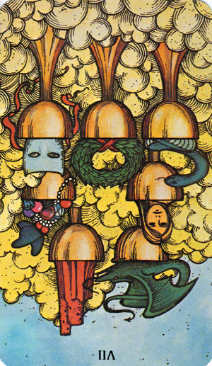The 7 of Cups is about making a choice between different ideals. But Cups, with the water element, don't like making definitive choices that much, making this 7 in this suit a bit of a hard choice.