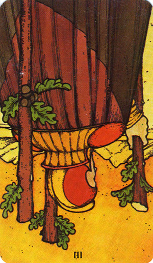 This card is about exposing your new ideas to the world. The Wand's element fire goes well with the number 3, as 3 is an output number, a number of results. Fire likes getting to results quickly.