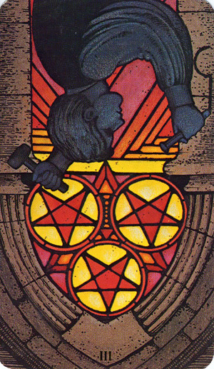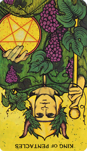 The King of Pentacles uses his Earthly attributes to rule. He goes about his work like an old style business man; he avoids unnecessary risks, aims for real results, and acts from confidence.