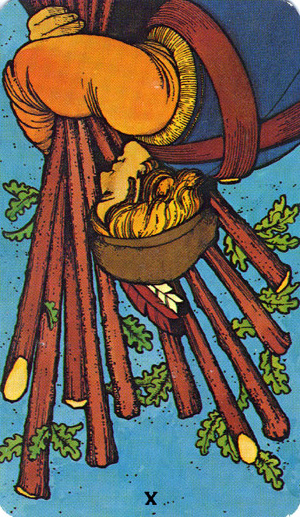 The 10 of Wands is therefore the transition from the element Fire (associated with Wands) to the element Water, associated with Cups. As you might imagine, this not the easiest of transitions.