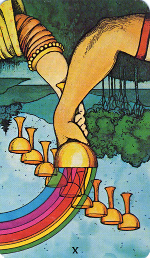 The 10 of Cups is the link to the Swords suit. It is time to leave your own emotions behind and face the world and the tasks ahead.