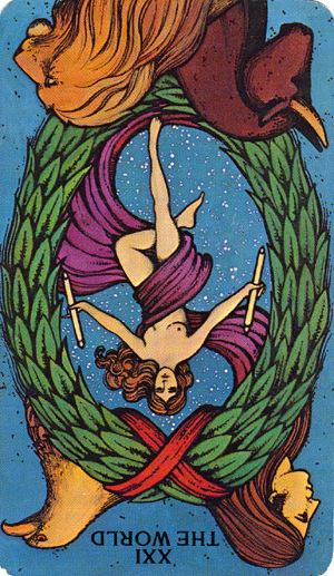 This card falls when you've completed all assignments, overcome all obstacles and are completely at peace with yourself due to your accomplishments. Yet Tarot wouldn't be Tarot if it didn't challenge you to enter entirely new worlds and start the process all over again.