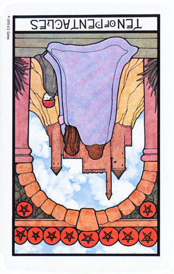 The 10 of Pentacles represents material posessions. The number 10 of Pentacles forms the links to the Ace (first card) of Wands (the first suit in the minor Arcana), and thus prepares to bring you back to the beginning of the minor Arcana, ready for a next cycle through the tarot.