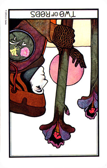 The 2 of Wands represents the research and digestion of a new idea. The number of this card and it's element are somewhat in conflict; while the 2 is focussed inwards, the Wand's element fire is outgoing. Fire wants to steam ahead while the blackbox 2 asks for patience.