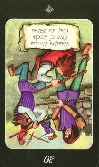 The 9 represents rest after work, which is another thing (like 8) that the element Fire associated with Wands is not very comfortable with. Fire likes to keep going. This rest will probably be spent thinking about what to do next along the course to completion.