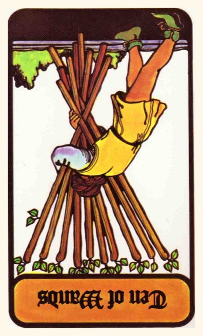 The 10 of Wands is therefore the transition from the element Fire (associated with Wands) to the element Water, associated with Cups. As you might imagine, this not the easiest of transitions.
