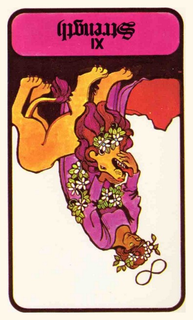 This card carries the number 11. In the Rider-Waite deck, Strength and Justice have swapped places because Waite saw links with the astrological signs Leo and Libra.