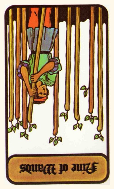 The 9 represents rest after work, which is another thing (like 8) that the element Fire associated with Wands is not very comfortable with. Fire likes to keep going. This rest will probably be spent thinking about what to do next along the course to completion.