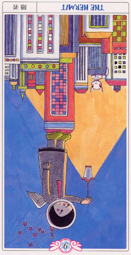 The Hermit shuts out the world and retreats into solitude to better understand some spiritual aspect of life. He opens to the cosmos and lets it's wisdom sink in. Hermits are often seen as wise old men who can guide a traveller along a journey.