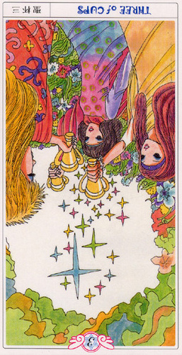 The 3 of Cups represents hope, faith and love. The 3 is a reward number and in this suit of Cups your feelings during that number will be that of joy and self-contentment.