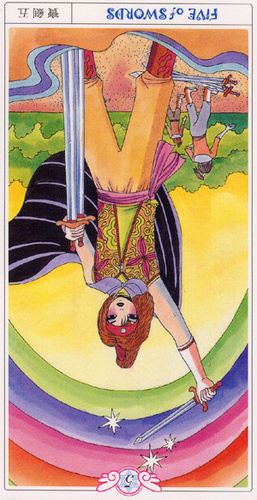 The 5 of Swords is about facing reality. The 5 is an assignment number, and in the slighly more difficult suit of Swords, it means you face a difficult challenge where your past experiences could hold you down.