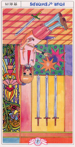 4 is the first number in the cycle of giving things shape. It's about making things real. The element of Swords also relates to making things real, so this enhances the effect so much that arrogance can cause you to exhaust yourself.